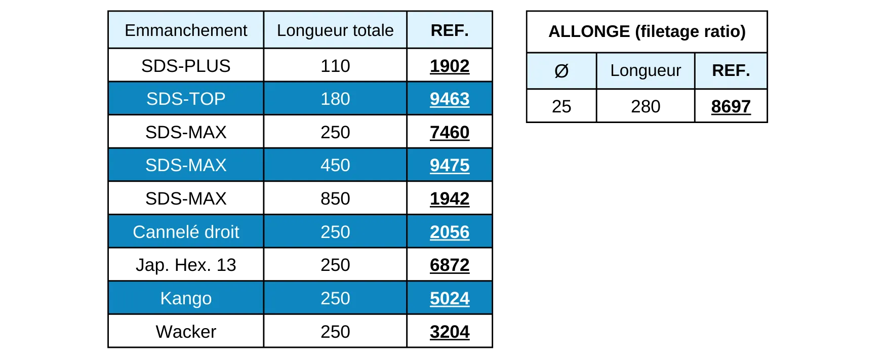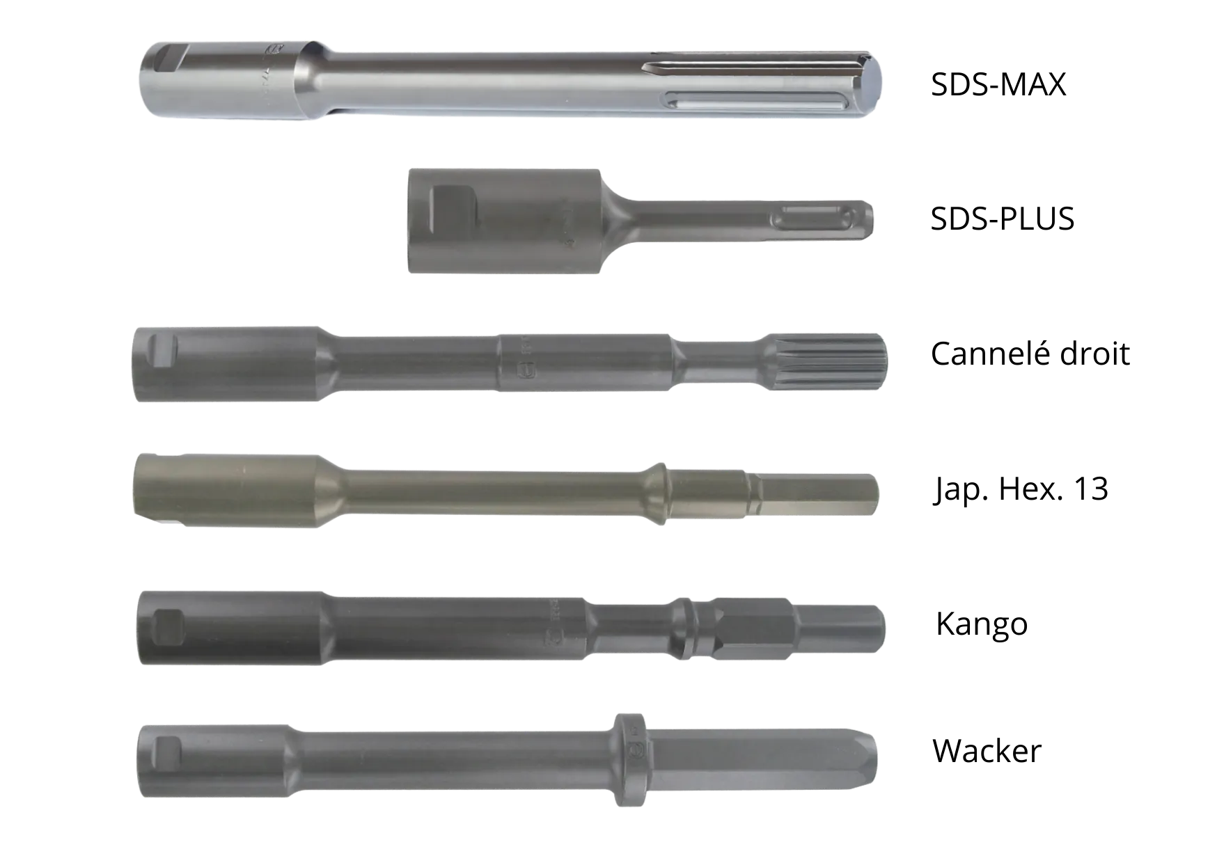 Plusieurs emmanchements disponibles : SDS-PLUS, SDS-TOP, SDS-MAX, Cannelé droit, Jap. Hex. 13, Kango, Wacker