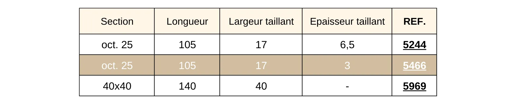 – Pontiote en acier traité : octogonale 17x25x105mm. Deux épaisseurs disponibles.