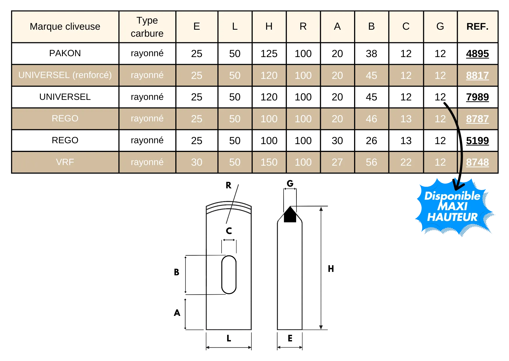 Plusieurs références existantes, possibilité de réaliser des couteaux sur-mesure en fonction de vos besoins spécifiques.