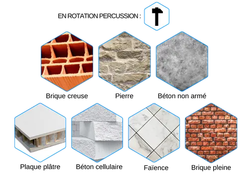 – Avec percussion, le béton, la brique (creuse ou pleine), la pierre.