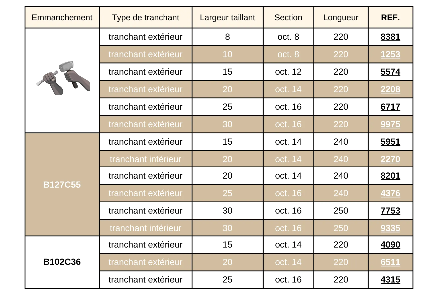 – la trousse de 10 outils B127C55 (ref. 4196) : 1 ciseau 10mm, 1 ciseau 20mm, 1 ciseau 30mm, 1 gradine 5 dents pointues 15mm, 1 gradine 6 dents pointues 22mm, 1 gradine 5 dents plates 25mm, 1 gradine 7 dents pointues 29mm, 1 pointe acier, 1 gouge 10mm, 1 gouge 15mm