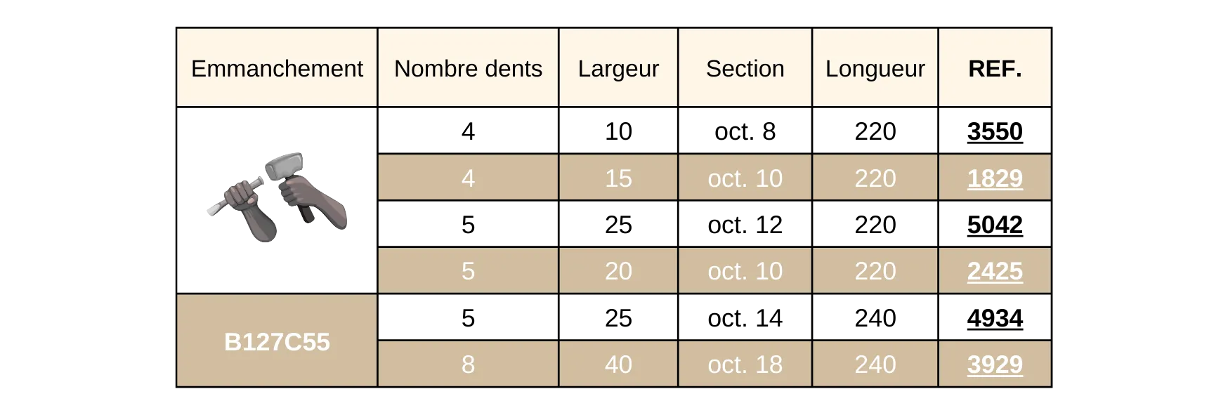 – pneumatique avec emmanchements : B102C36 ou B127C55