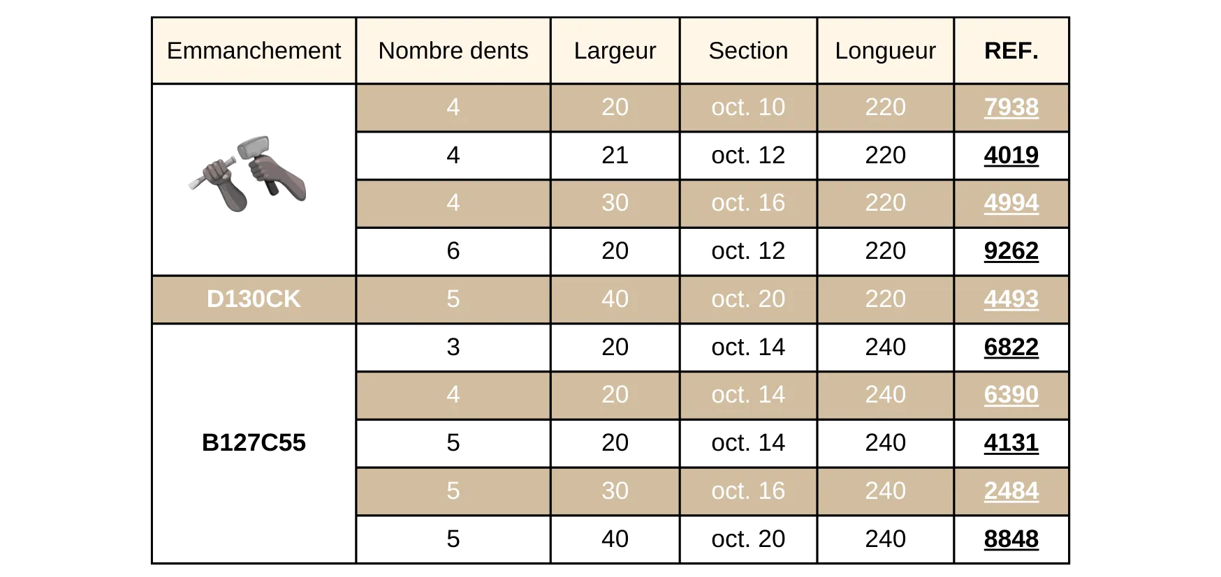 – pneumatique avec emmanchements : D130CK ou B127C55