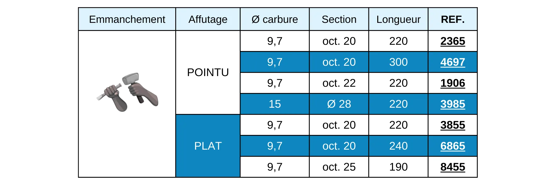 Poinçon carbure FORT, modèle pointu ou plat, pour des travaux lourds de type « bûchage » ou « brochage » grâce au carbure en forme d’ogive de plus gros diamètres.