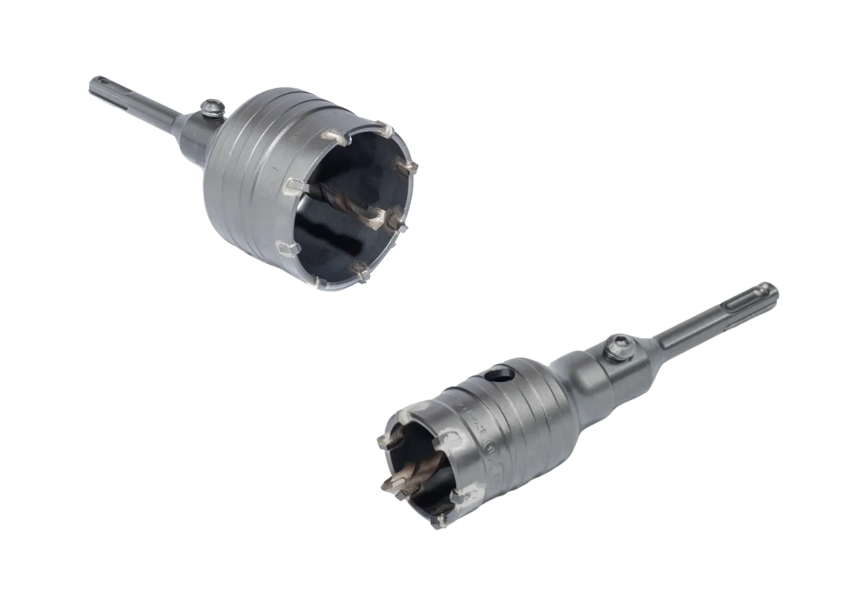 Montage : trépan + porte-trépan (SDS-PLUS ou Hex. 12) + foret centreur (dans la gamme Trépan OPTIMA filetage M16 SDS-PLUS /SW12 hex.12).