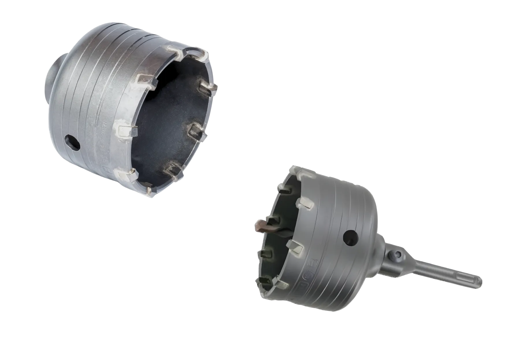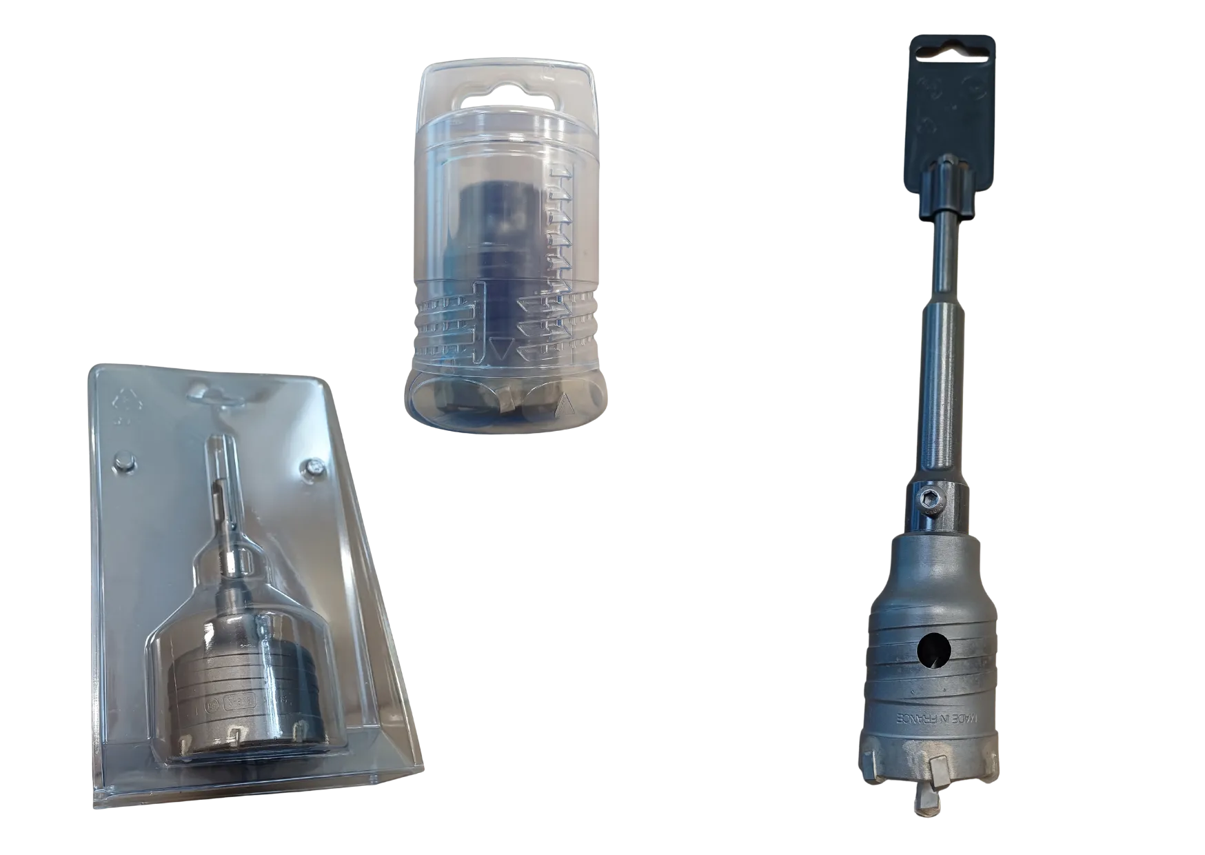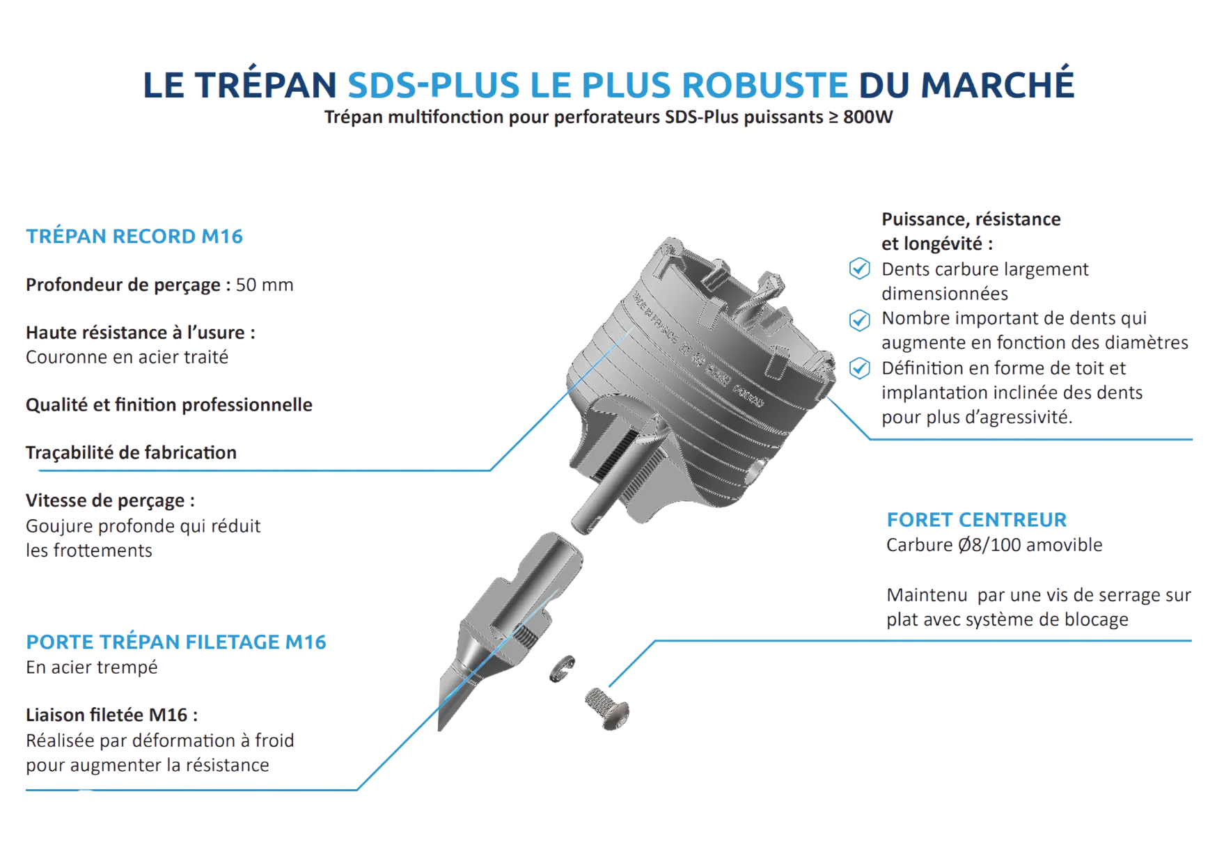 Montage : trépan + porte-trépan (SDS-PLUS ou Hex. 12) + foret centreur (dans la gamme Trépan OPTIMA filetage M16 SDS-PLUS /SW12 hex.12).