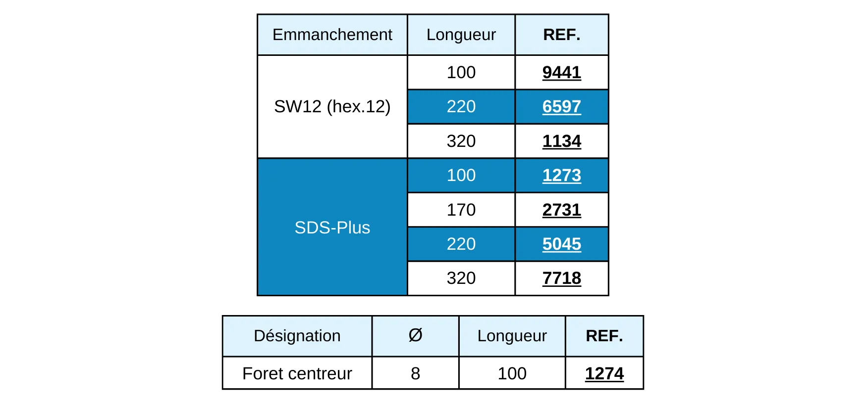 Emmanchements : SDS-PLUS ou SW12 (hex.12), disponibles en 4 longueurs