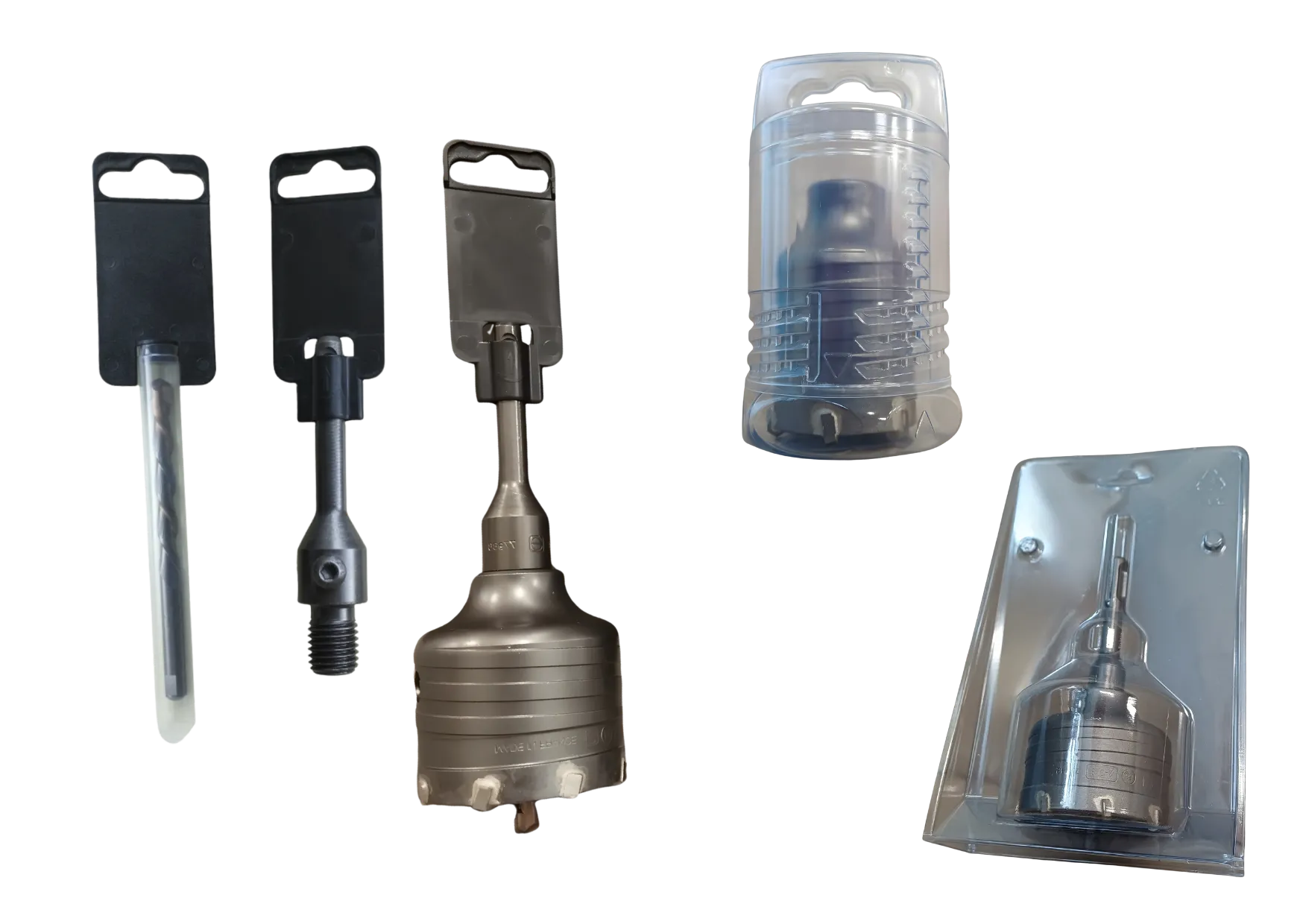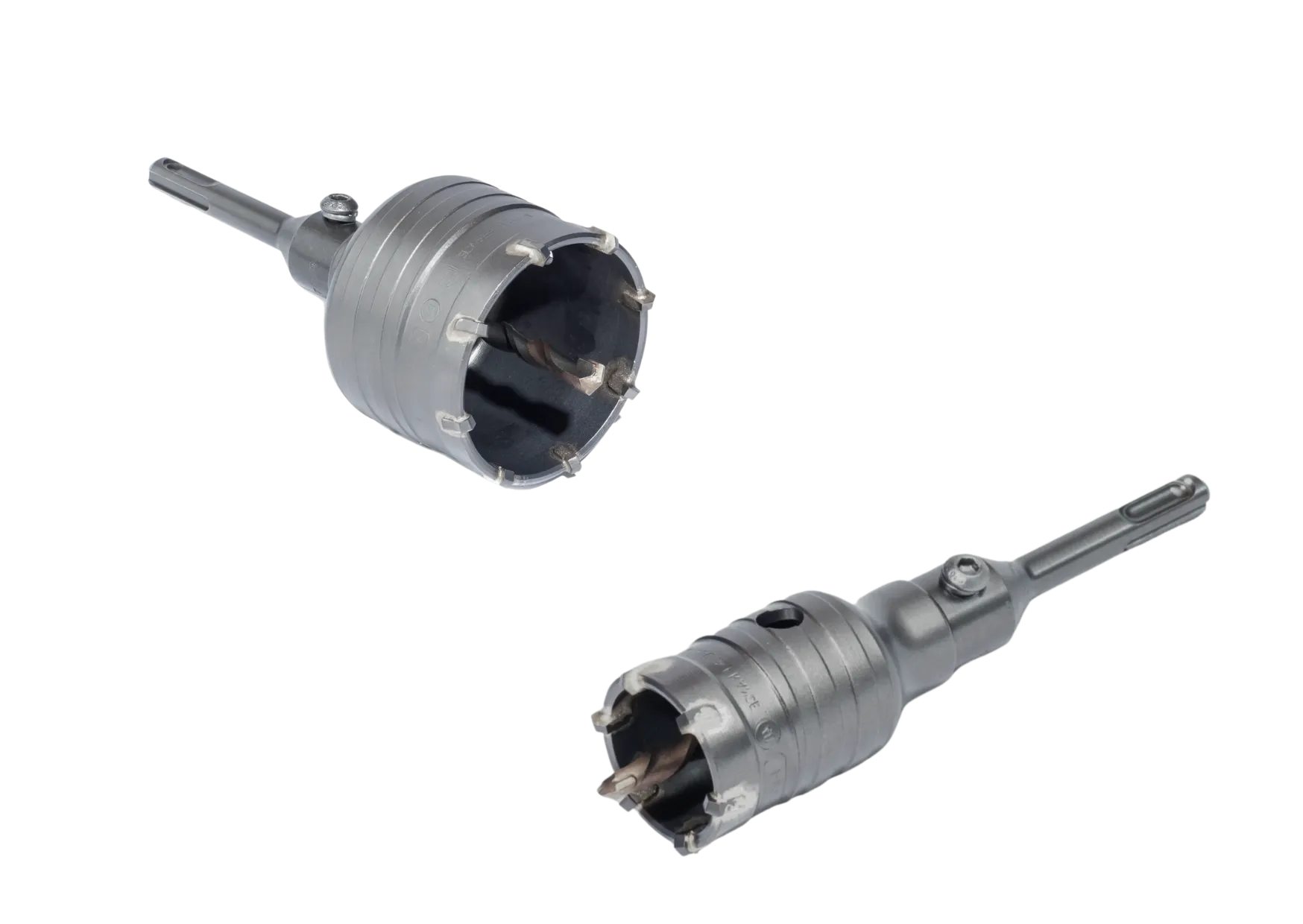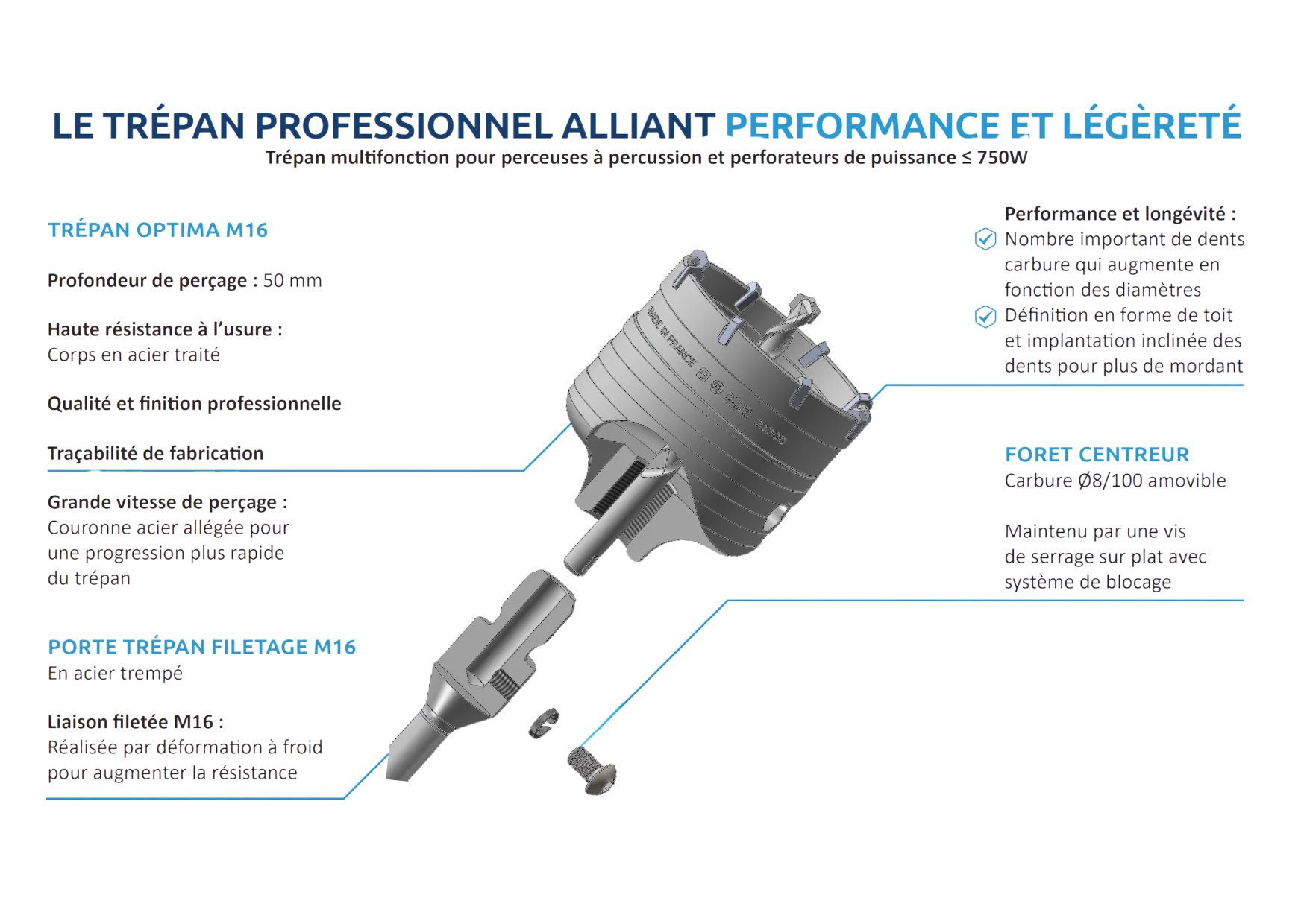 Montage : trépan + porte-trépan (SDS-PLUS ou Hex. 12) + foret centreur (dans la gamme Trépan OPTIMA filetage M16 SDS-PLUS /SW12 hex.12).