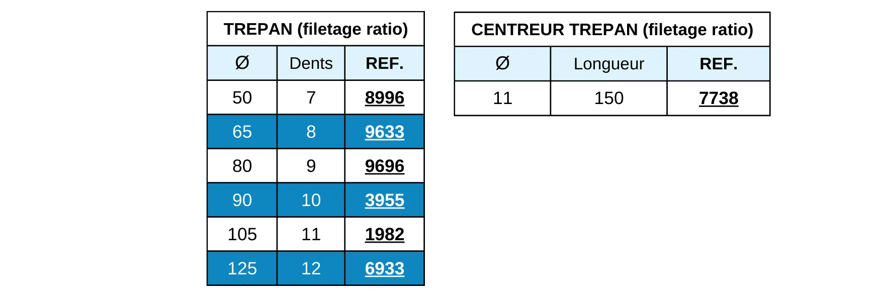 Trépan couronne avec plaquettes en carbure de tungstène, avec liaison filetage ratio de la gamme modulable MEGADRILL (livré sans foret centreur : ref.7738)